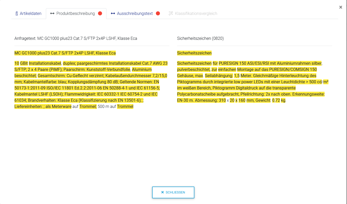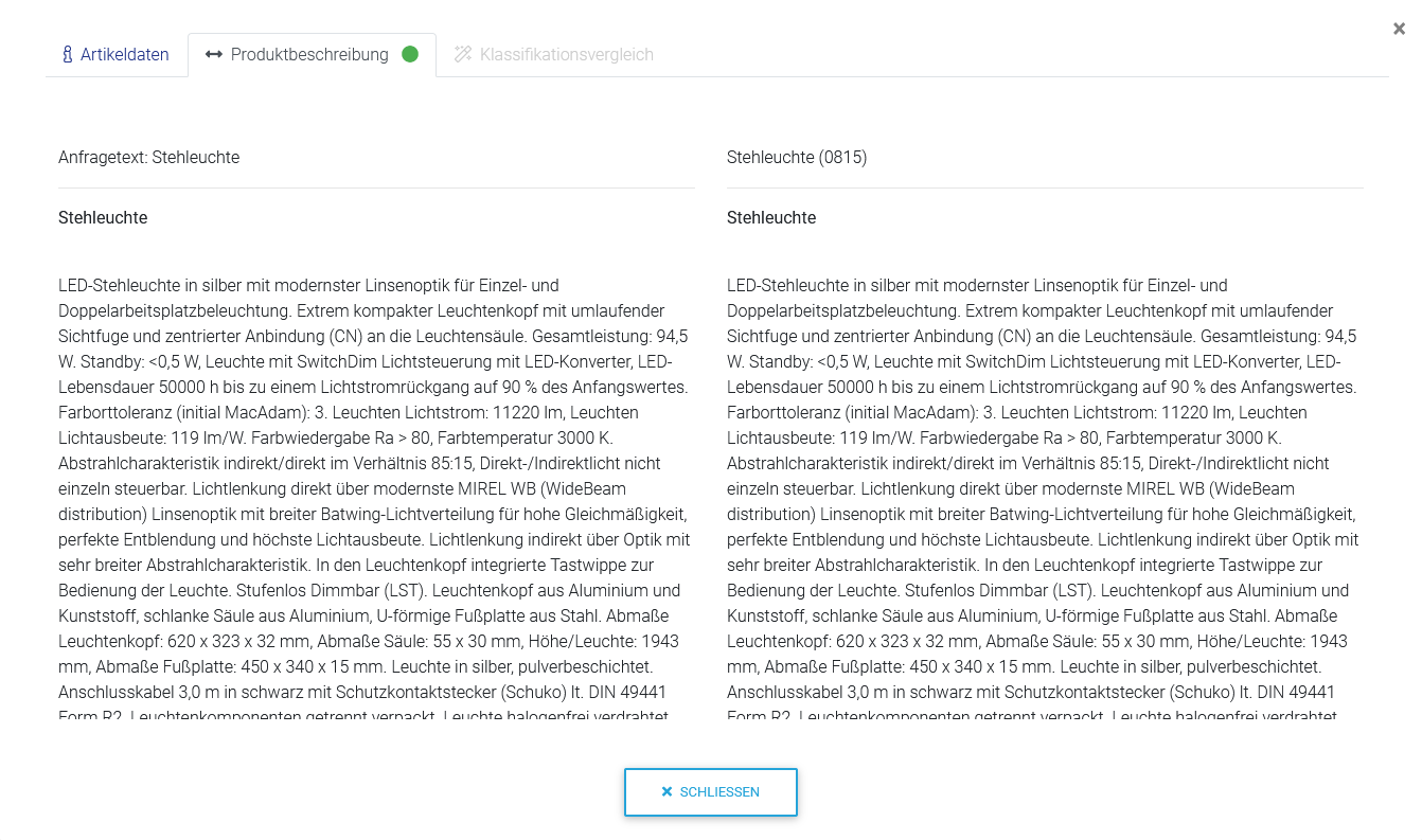 Ist eine Position in der Baumstruktur in ePlato orange markiert, konnte das System eine Zuordnung finden. Markiert man nun die Position erhält man einen Artikelvorschlag. Dort befindet sich die Bezeichnung „Textvergleich“ mit einer entsprechenden farblichen Markierung. Klicken Sie auf die auseinander zeigenden Pfeile, erhalten Sie die Gegenüberstellung des Texts und sehen dort, wie eindeutig der Artikel zugeordnet werden kann.