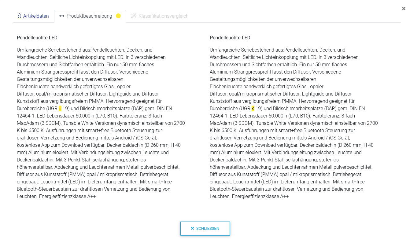 Grün: Es gibt eine 100% Übereinstimmung der Beschreibungen. Der Artikel ist identisch.