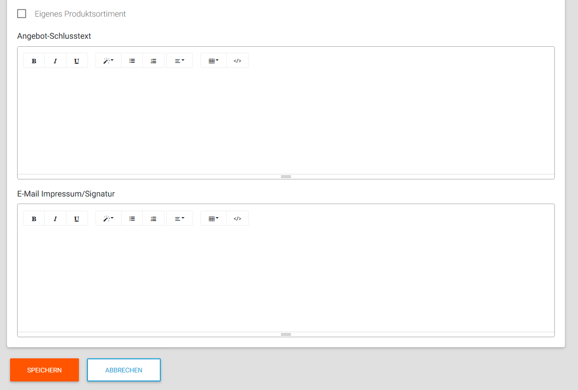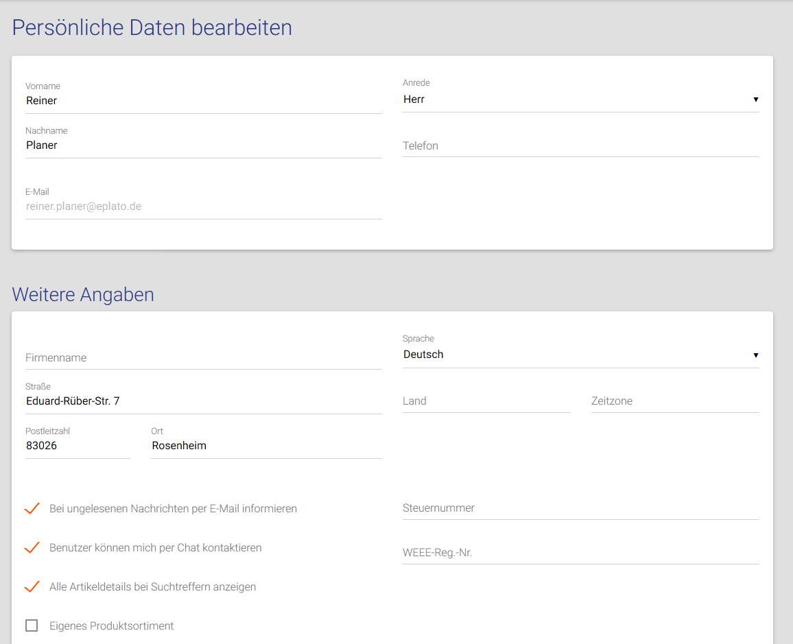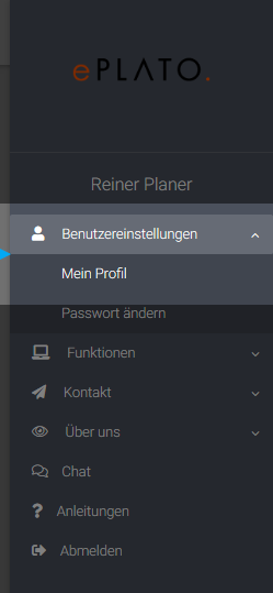 Als erstes über den Menübutton oben rechts im Bild „Benutzereinstellungen“ auswählen und anschließend auf „Mein Profil“ gehen. Unter „Mein Profil“ gelangen Sie über „Meine Persönlichen Daten“ zur Bearbeitungsseite. Dort können Sie nun Ihre Kontaktdaten, Anschrift sowie sämtliche Angaben zum benutzerdefinierten Angebotstext bzw. Angebotsimpressum hinterlegen. Dieser Schritt ist jedoch überflüssig, wenn für Ihre Firma bereits ein Schlusstext vorhanden ist. Befragen Sie hierfür am besten Ihren Firmenadministrator oder wenden Sie sich an den ePlato Support. Des Weiteren haben Sie die Möglichkeit ein Angebotsimpressum zu hinterlegen. Diesbezüglich gilt dasselbe wie beim Angebotstext. Besprechen Sie mit Ihrem Firmenadministrator, ob bereits ein Impressum vorhanden ist.