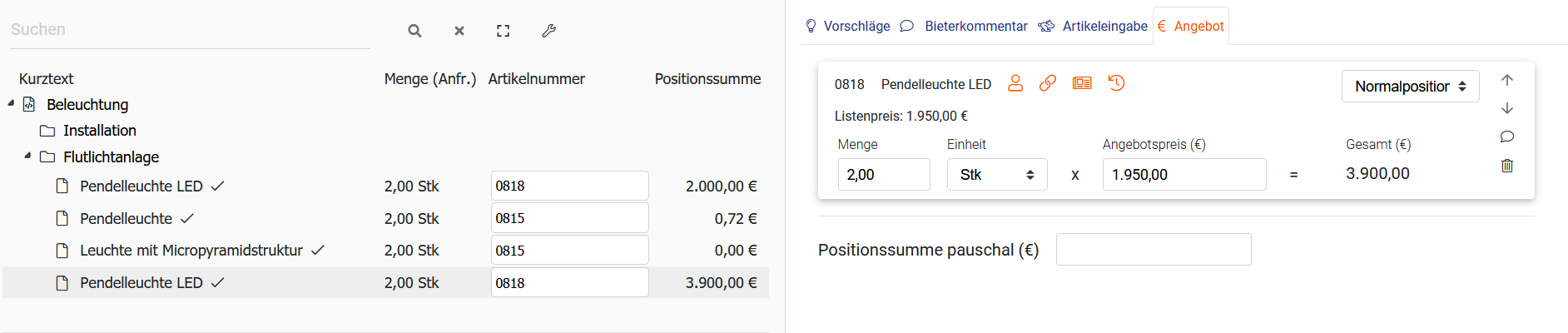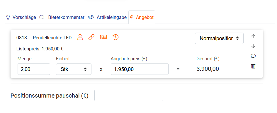 Wollen sie keinen Einzelpreis, sondern eine Pauschalsumme angeben, können Sie das ebenfalls machen. Dafür nutzen Sie das Eingabefeld unterhalb des Artikels bei „Positionssumme pauschal“. Diese wird nachdem Sie die Eingabe mit Enter bestätigt haben, auf der linken Seite ergänzt.