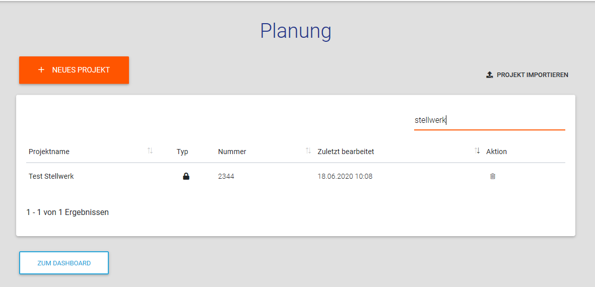 Wählen Sie über das Dashboard die Kachel „Planung“ aus. Sie gelangen auf die Übersichtsseite sämtlicher Projekte. Dort haben Sie die Möglichkeit bereits angelegte Projekte zu bearbeiten bzw. neue Projekte hochzuladen. Wollen Sie eine vorhandene Datei bearbeiten, klicken Sie einfach auf das entsprechende Projekt.