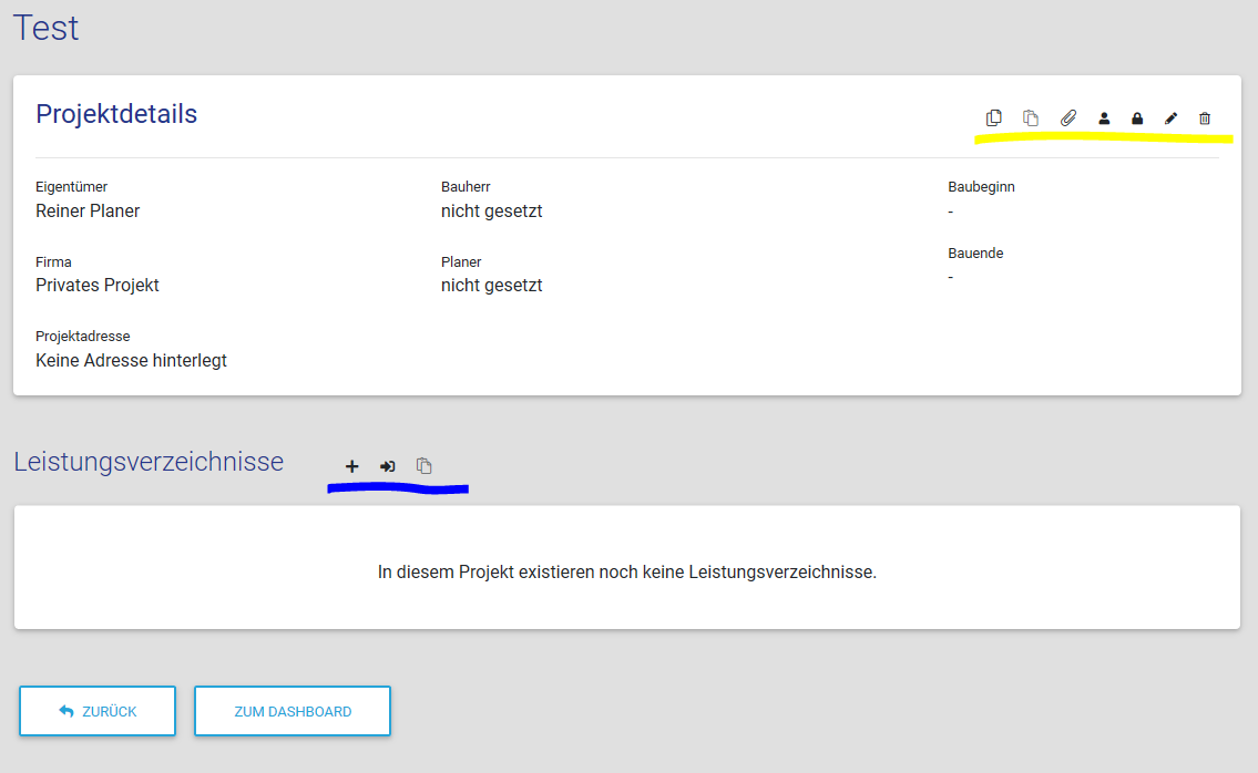 Für eine neue Planung gehen Sie auf den Button „Neues Projekt“. Sie können nun Angaben zum Projekt machen und diese speichern. Im Anschluss können die Produktdetails geplant werden. Über die Funktionen rechts oben im Eck (gelbe Markierung) kann das Projekt weiter definiert werden: